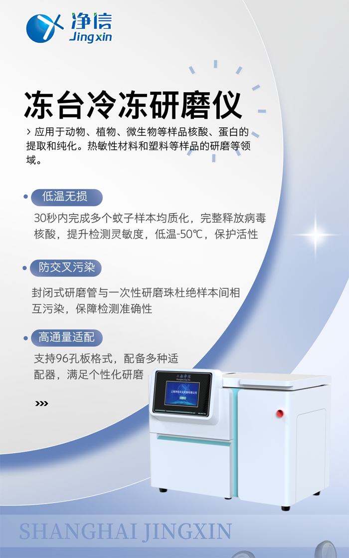 凈信凍臺冷凍研磨儀以標(biāo)準(zhǔn)化、自動化的研磨方案,助力疾控中心構(gòu)建更快速的蚊媒病毒響應(yīng)體系。它不僅解放了實驗室人力,更通過提升樣本處理質(zhì)量,為流行病學(xué)研判提供可靠技術(shù)支撐,默默守護(hù)著公共衛(wèi)生安全的第一道防線。