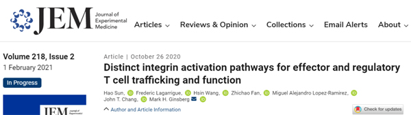2020年10月27日,加州大學(xué)圣地亞哥分校醫(yī)學(xué)院,聯(lián)合法國圖盧茲大學(xué)和康涅狄格大學(xué)衛(wèi)生院的科學(xué)家在Journal of Experimental Medicine(JEM) 上在線發(fā)表了題為Distinct Integrin Activation Pathways for Effector and Regulatory T cell Trafficking and Function的工作(來自作者為孫昊博士)。